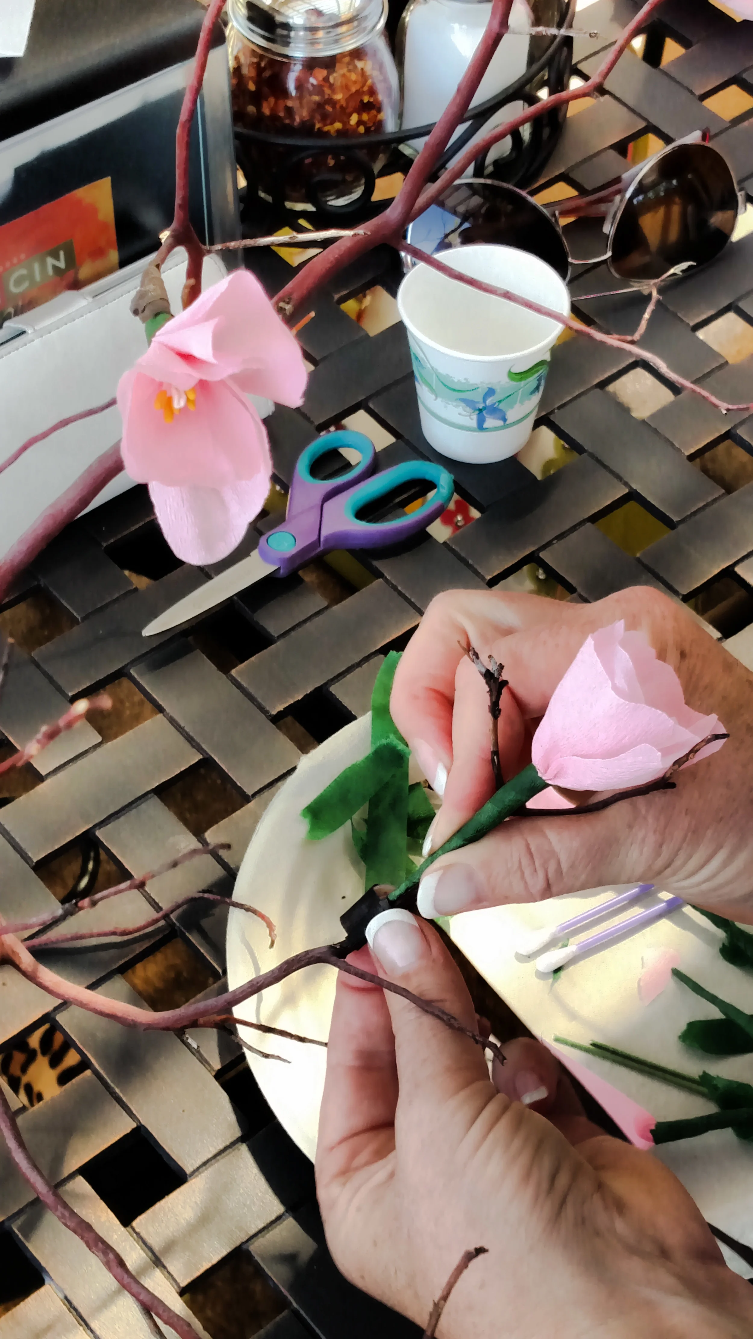 Attaching white blossoms to her Cherry Blossom Branch at Dancin Vineyards.